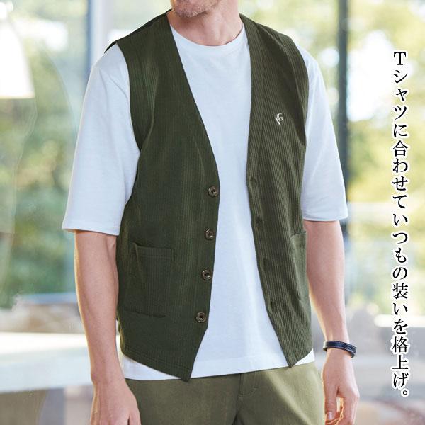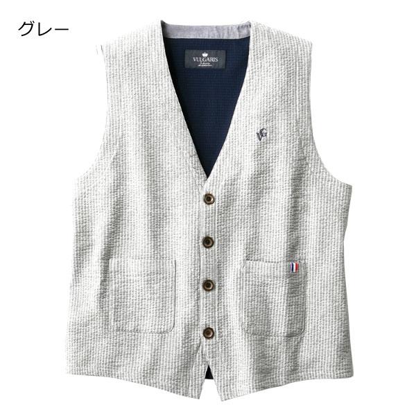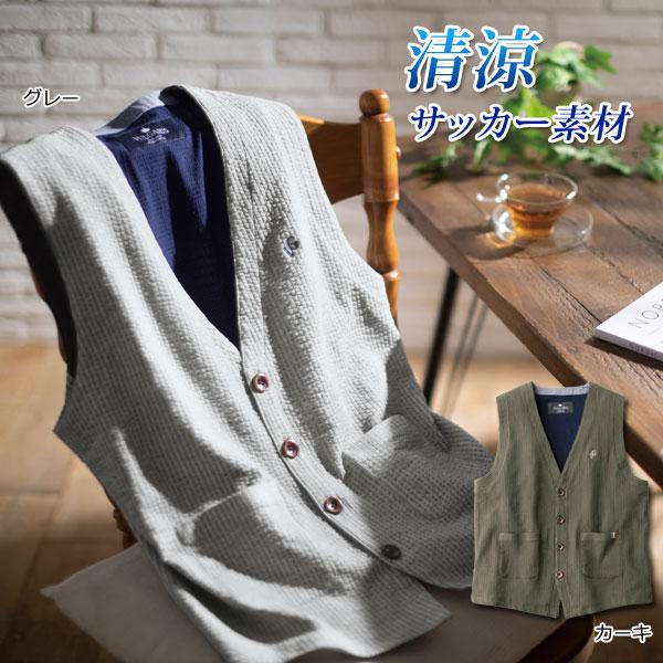 ポコポコとした肌ざわりのサッカー素材を前側に、ドットメッシュ素材を背中側に使った、涼やかなベスト。シンプルなTシャツに合わせるだけで、お洒落感漂うお出かけスタイルに。あると便利な内ポケット付き。合わせやすい定番カラーのグレーとカーキの2色からお選びいただけます。