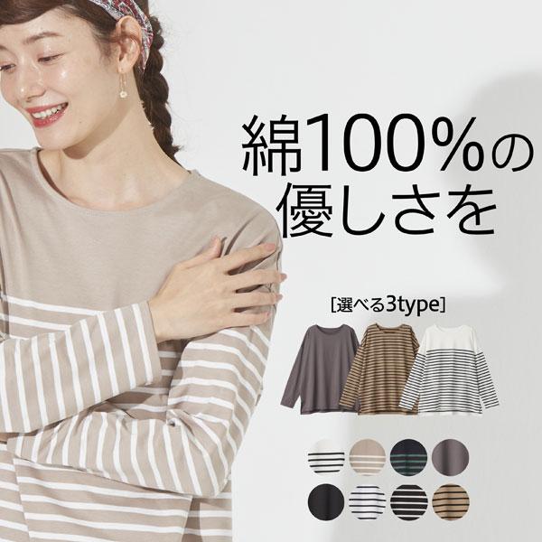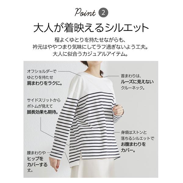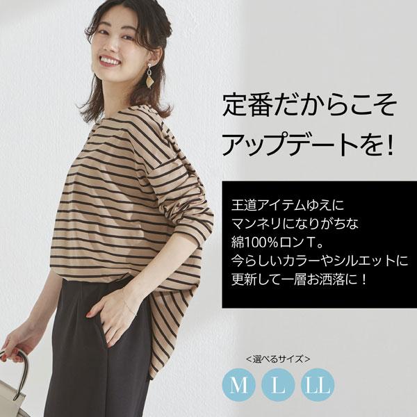王道アイテムゆえにマンネリになりがちなロングTシャツを、今らしいカラーやシルエットにアップデート!適度な厚みがあり透け感のない綿100%素材で、天然素材の優しい肌当たりと自然な風合いが魅力。程よくゆとりをもたせながらも、衿元はややつまり気味にしてラフ過ぎないよう工夫し、大人に似合うカジュアルアイテムに仕上げました。腰まわりやヒップをカバーする丈で、身頃はストンと落ちるシルエットでお腹周りをカバー。