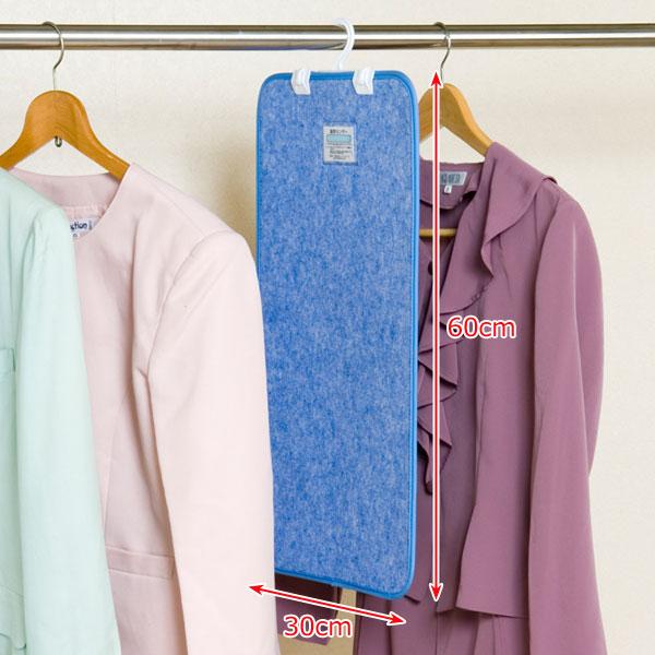雨に濡れたり、汗の臭いや湿気を吸った衣服は、虫やカビ・菌の大好物です。そのまま放っておくと大切な衣服がダメに・・・。そんな時にこの快適タンスドライを付属のフックハンガーに取り付け、衣服と一緒にクローゼットに掛けておけば、優れた吸湿力と消臭効果を発揮して衣類を守ります。その理由は、テイジンの高吸湿繊維「ベルオアシス(R)」(乾燥剤シリカゲルの2〜3倍、綿の約7倍の吸湿性能)を素材に使っているからです。またベルオアシス(R)は、アンモニア(汗)に対しての消臭効果もあります。