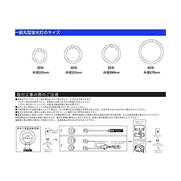 商品仕様 LED丸型蛍光灯 、点灯方式:グロー式、口金:G10q 、サイズ :φ 30 * 205mm (20形)、φ 30 * 225mm (30形)、φ 30 * 299mm(32形)、φ 30 * 375mm(40形) 、色温度:昼光色 6000K、昼白色 5500K、電球色 3000K 、消費電力:約9W(20形)、10W(30形)、14W(32形) 、18W(40形) 、電圧:AC100V、 定格周波数:50/60Hz 、全光束、20形:1125LM (昼光色) 、945LM (昼白色)、920LM (電球色)、30形: 1250LM(昼光色)、1050LM(昼白色) 、1000LM (電球色)、32形:1750LM (昼光色)、1470LM(昼白色) 、1400LM(電球色)、40形:2250LM (昼光色)、1890LM(昼白色) 、1800LM(電球色)、設計寿命:約40000時間
