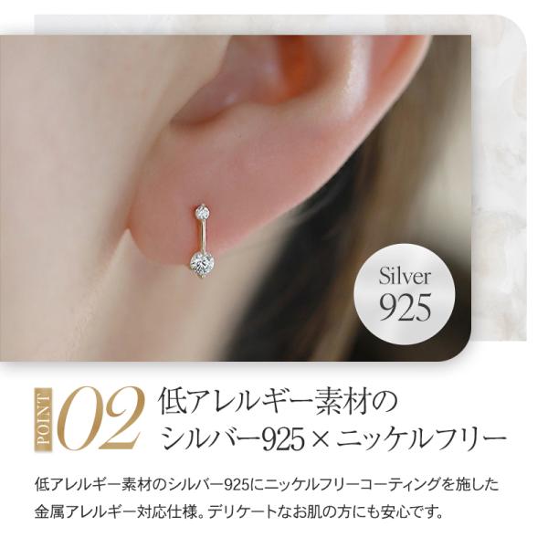 キャッチが無く、カチッとはめるだけのミニマルなデザイン。ピアスを落としたりキャッチを無くす心配がないのも嬉しいポイントです。