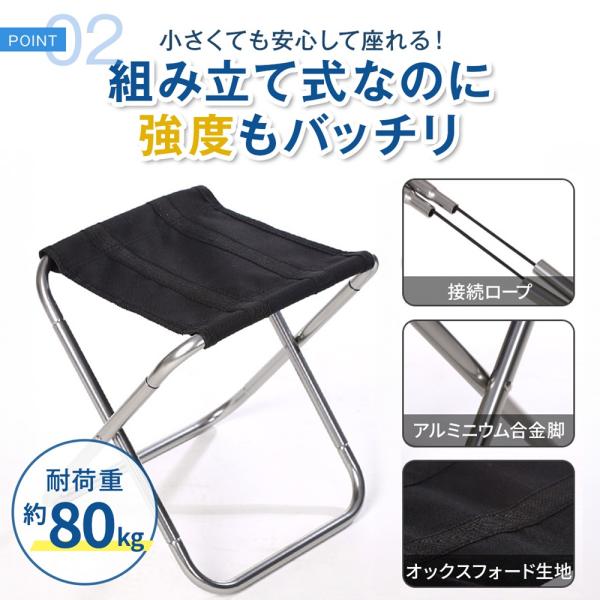 丈夫なオックスフォード生地とアルミのため、小さいながらも強度はバッチリ。耐荷重約80kgのため、安心してお座りいただけます。