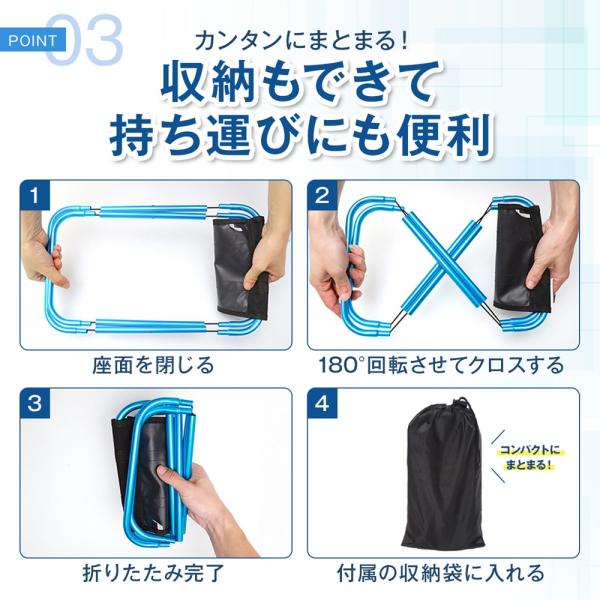 たったの4工程で簡単に、折りたたみ収納可能。付属の収納袋もあるため、保管も持ち運びも困りません。