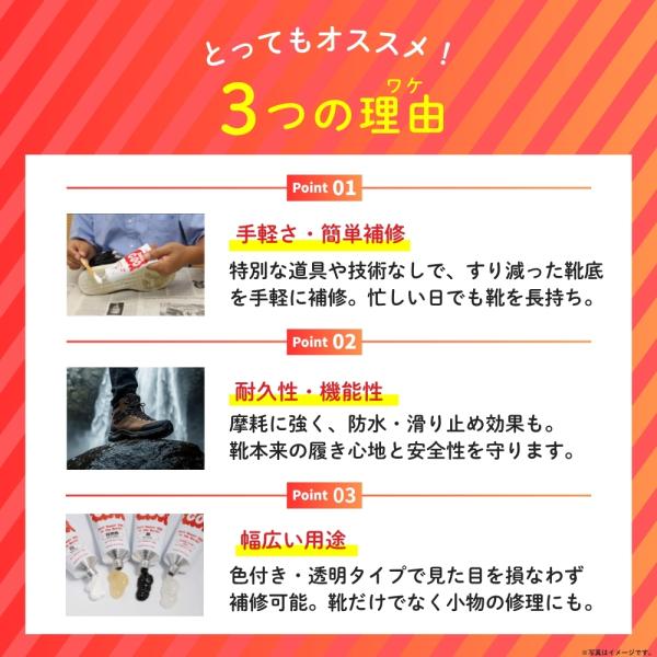 【用途】ゴムブーツ・長靴やウェットスーツなどのゴム製品の補修。スニーカー、ブーツ、サンダルなどのかかと補修