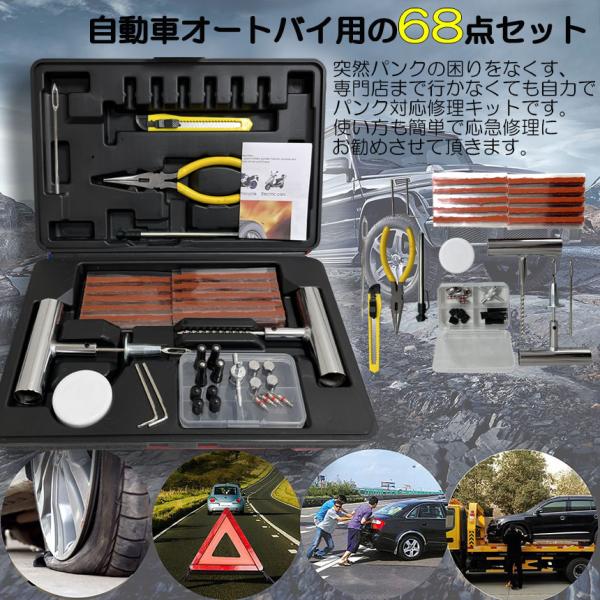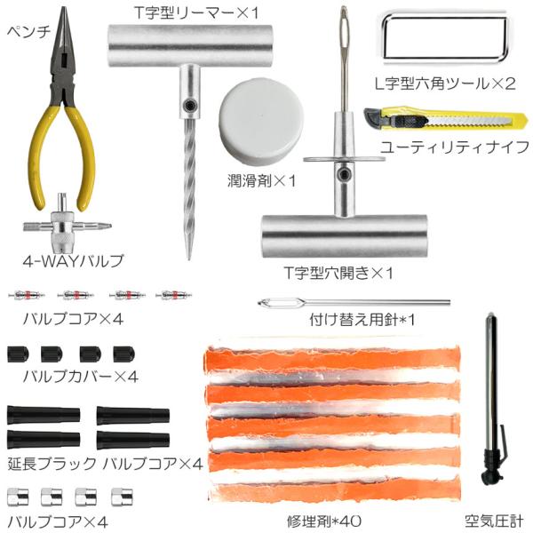【セット内容】合計68点セット リーマー*1 穴開き*1 プライヤー*1 リーマー備品*1 カッター*1 六角レンチ*2 グリス*1 補修シール材*40 タイヤゲージ*1 バルブコア*4 バルブ多用途レンチ*1 バルブキャップ*12 リーマー備品*1 収納ケース*1