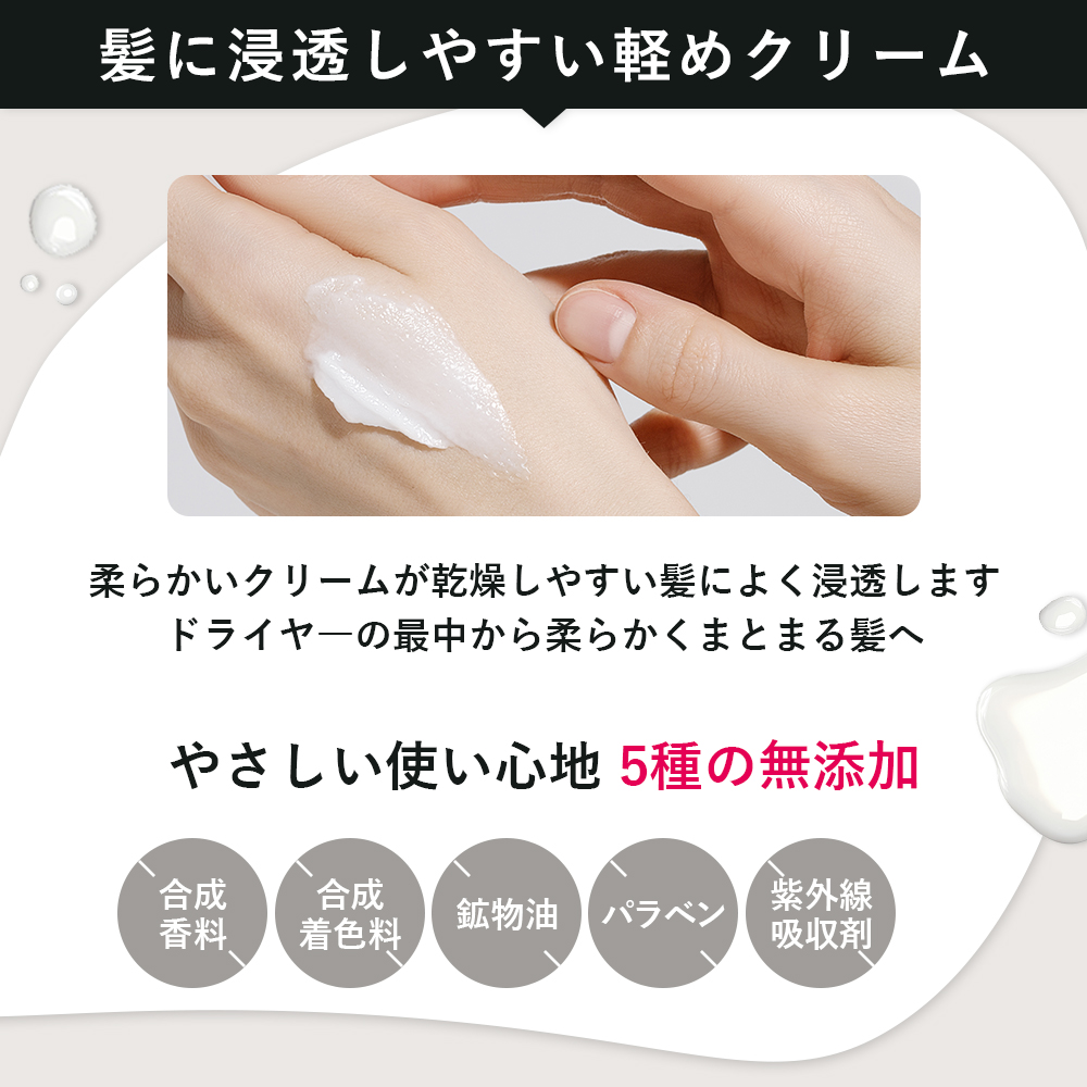 ベタつかず軽めで柔らかいクリームが、乾燥しやすい髪によく浸透します。5種の無添加※で髪へのいたわりも忘れません。(※合成香料・合成着色料・鉱物油・パラベン・紫外線吸収剤:全て不使用)