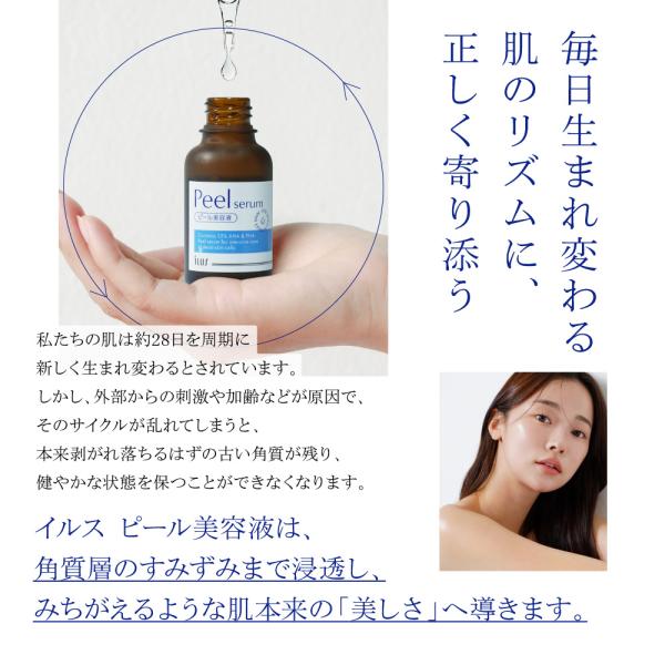 ILUS ピール美容液は、肌をやわらげなめらかにするために特別に設計された3種の酸(マンデル酸(AHA)、ラクトビオン酸、グルコノラクトン(PHA))を高濃度15%配合。毎日生まれ変わる肌のリズムに正しく寄り添い、肌のキメを整えます。