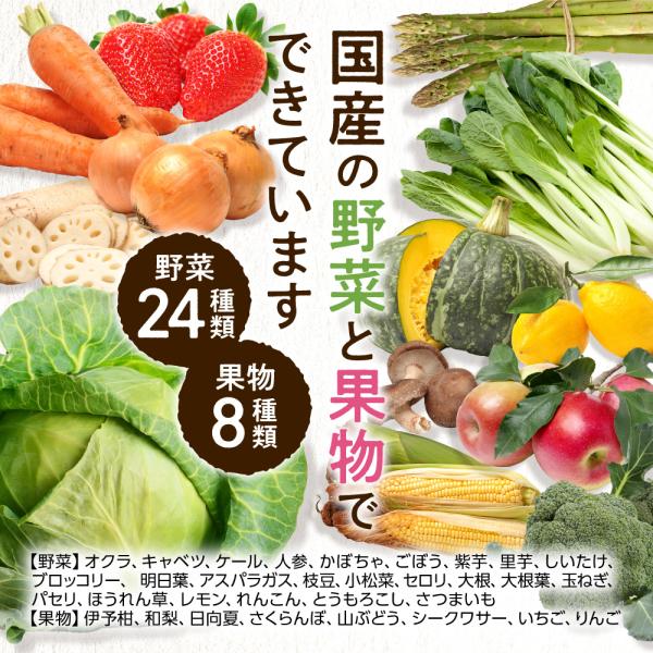 国産野菜と24種類、国産果実を8種類、さらに8種類のスーパーフードをぎゅっとサプリメントにしました。 栄養バランスもしっかり考えました。ベジーグッドはマルチビタミン(ビタミンB1、ビタミンC、ビタミンE)をしっかり1日分配合、野菜不足がきになる方におすすめの野菜サプリメントです。 青汁のような苦味がなく穀物の風味と野菜果実の甘みを感じる優しい風味で飲みやすい。野菜ジュースのように糖質やカロリーを心配する必要もありません。