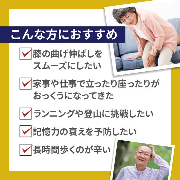 ※1.膝関節の動きに悩みのある方の膝関節の可動性(曲げ伸ばし)をサポートし、膝の不快感をやわらげる機能。※2.年齢とともに低下する脚の筋力に作用することにより、中高年の方の歩く力を維持する機能。※3.健常な中高年者の加齢によって低下する、認知機能の一部である記憶力(日常生活で見聞きした情報を覚え、思い出す力)の精度や判断力(判断の正確さ)を向上させる機能。