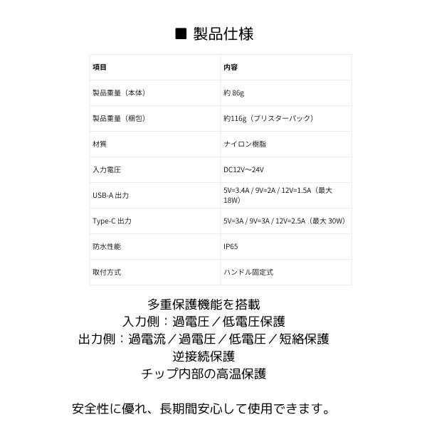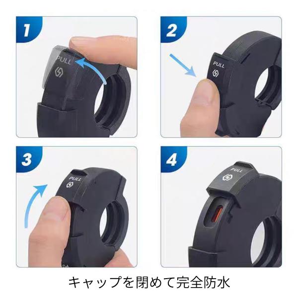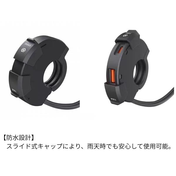 【防水設計】スライド式キャップにより、雨天時でも安心して使用可能。これにより、天候を気にせずにデバイスを充電でき、ライダーのストレスを軽減します。