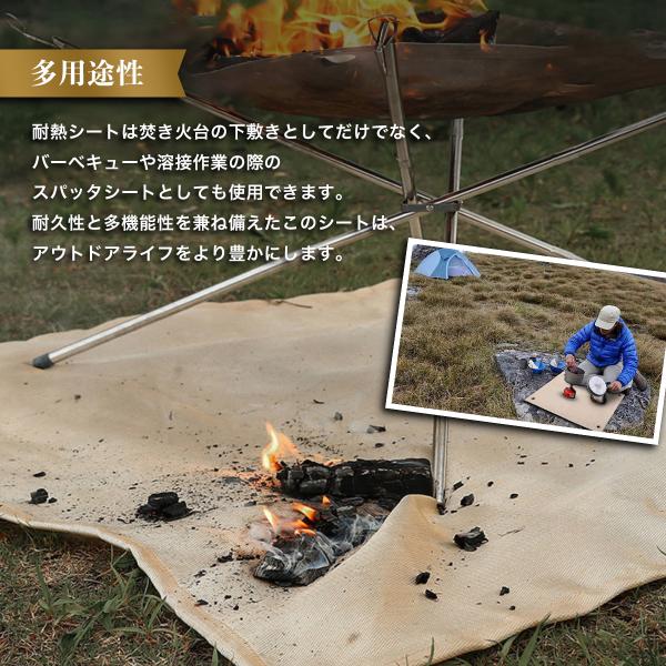 【多用途性】耐熱シートは焚き火台の下敷きとしてだけでなく、バーベキューや溶接作業の際のスパッタシートとしても使用できます。耐久性と多機能性を兼ね備えたこのシートは、アウトドアライフをより豊かにします。