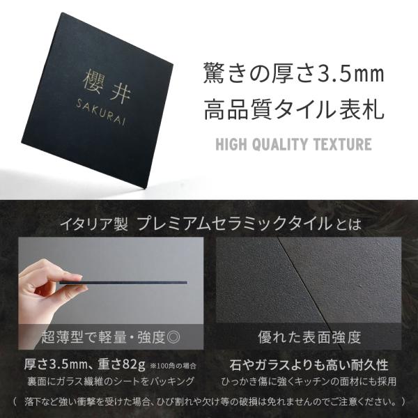 金属調の質感が魅力の薄型タイル表札。豊富なサイズ展開で6サイズから選べます。