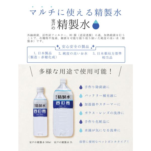 精製水 室戸の精製水 2L 6本 赤穂化成 殺菌剤 スチーマー アルコール エタノール スプレー 化粧水 蒸留水 アロマ 洗浄 医療用 化粧用 工業用 美顔器