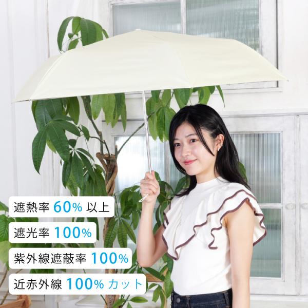 直射日光下でも、水やエネルギーを消費することなく、外気温より冷却できる「Radi-Cool」を使用。「放射冷却(熱を逃す力)」の温度上昇を抑える力と「遮熱率60%以上」で日傘表面から受ける熱の上昇を抑えます。実際に「Radi-Cool」の日傘を使用した時と使用していない時では照射30分後の頭部表面の温度上昇-37.1℃となり、その違いがサーモグラフィの画像で確認できます。(OFF WHITE傘と傘無しの比較)遮光率100%、紫外線遮蔽率100%の「一級遮光」で眩しい日差しや紫外線を遮ります。肌の深部にダメージを与えるといわれる近赤外線も100%カットします。雨の日も使える晴雨兼用日傘で指や爪を挟みにくい「安全ろくろ(ストッパー)」仕様で、ボタン操作もスムーズです。