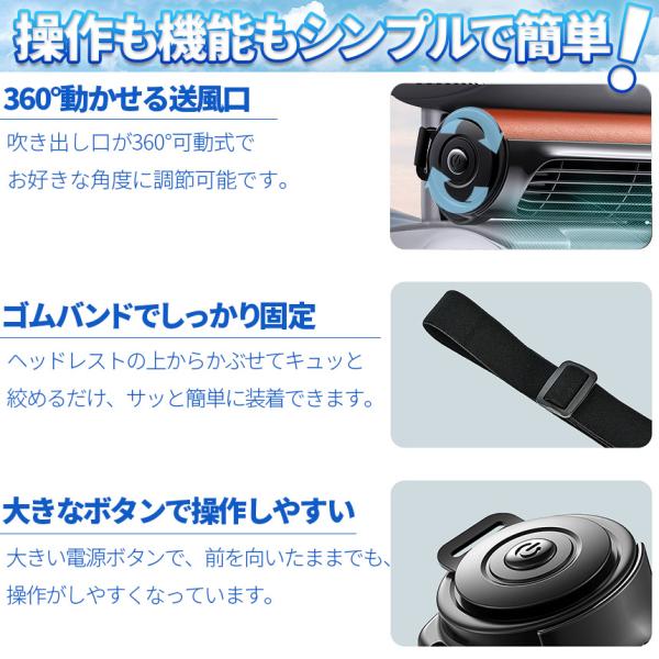 【車載電動強力ファン!首元背中に涼風!】取り付けは、ヘッドレストにゴムバンドでサッとつけるだけ♪付属のUSBのコードでつないで大きくて押しやすい電源を入れればあっという間に送風開始。3段階で風量も調節できます。360°お好きな向きにクルっと回して使えるので、便利!乗ってすぐの熱い車内で首元から体温を下げる、エアコンをいつもより弱めて省エネ、あると必ず役立つ便利グッズです♪