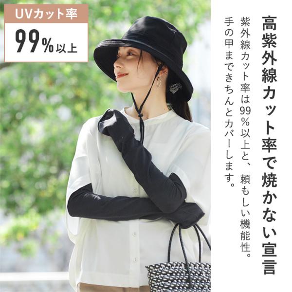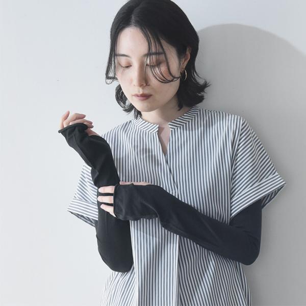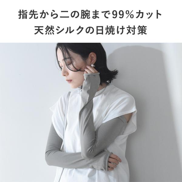 内側にシルクの生地を使用した、肌当たりの良いアームカバー。UVカット率99%以上でしっかり日焼け対策ができます。すっきりシルエットで動きやすく車の運転にも◎。