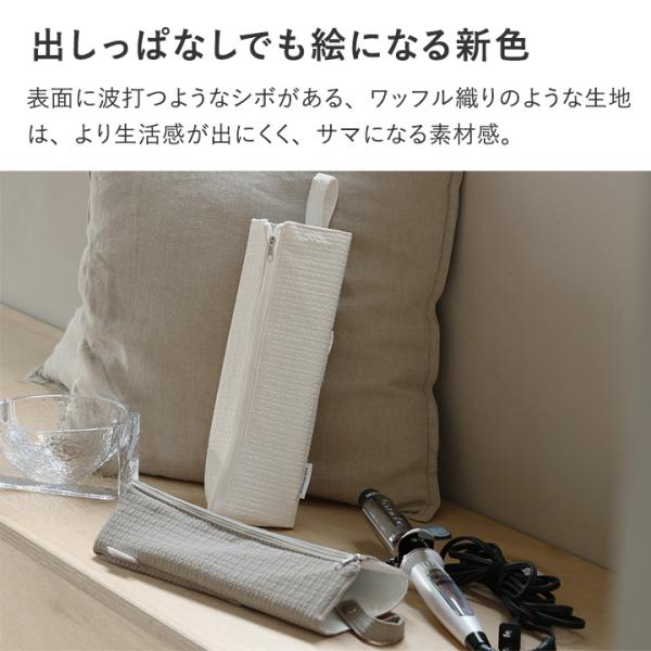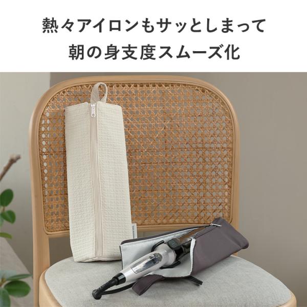 耐熱素材のヘアアイロンケース。洗面所に吊るしておけば、アイロンをスムーズに出し入れ&収納。洗面台でアイロンホルダーとしてや、旅行用のヘアアイロンポーチとしても使えます。