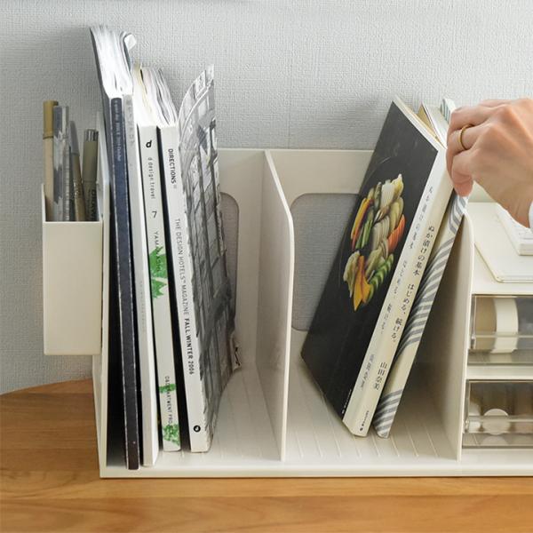 本もペンも文具もまとめて整理できるブックスタンド。子どもの勉強机や在宅ワークのデスクもすっきり。多機能なのにシンプルデザインなので、オフィスの卓上収納としても◎