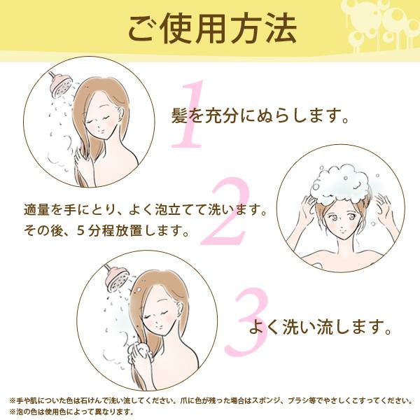 黒髪や暗い髪色に使用しても変化はありません。ハイダメージの髪に使用すると1度のご使用でもかなり濃く染まったり、ムラに染まる場合があります。