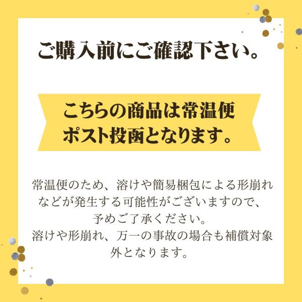 万一到着時に商品が溶けていた場合の返品交換は致しかねますので、あらかじめご了承下さい。