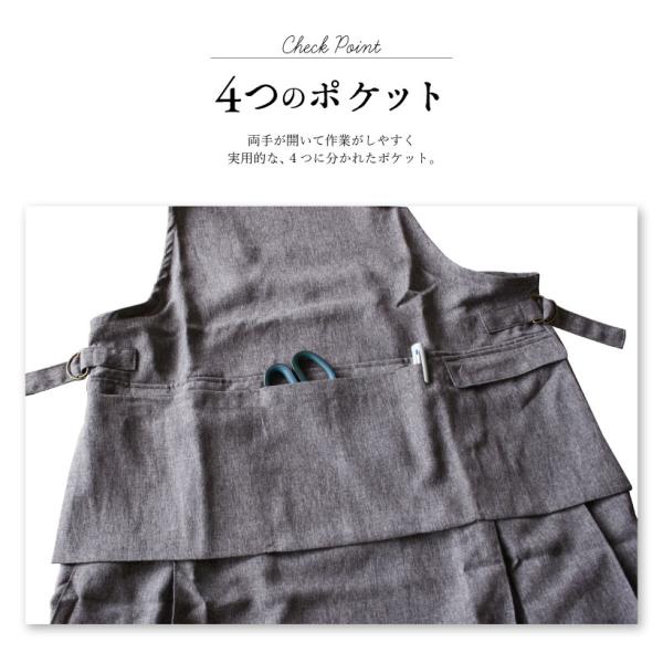 毎日のお手入れが簡単!フッ素樹脂加工で水を弾きシミになりにくい。さらさらとした生地でしわになりにくく、丈夫で通気性のいい、肌に優しい素材。布いっぱいについた4つのポケットは物を小分けに入れられ、両手が塞がらない実用的な造り。落ち着いた色味とプリーツスカート風な裾がアクセントになった、幅広いシーンで使いやすい高機能エプロンです。
