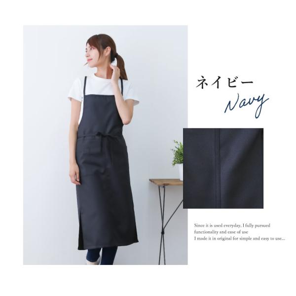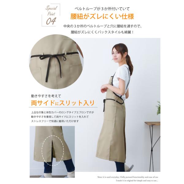 シンプル無地でおしゃれなデザインのロング丈のカフェエプロン。撥水加工で汚れにくく、シワになりにくいポリエステル素材でお手入れも楽ちん。便利なペン差しやポケット、裾のスリットなど、使いやすさを重視してデザインされたエプロンです。