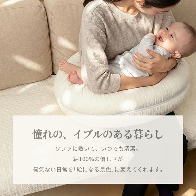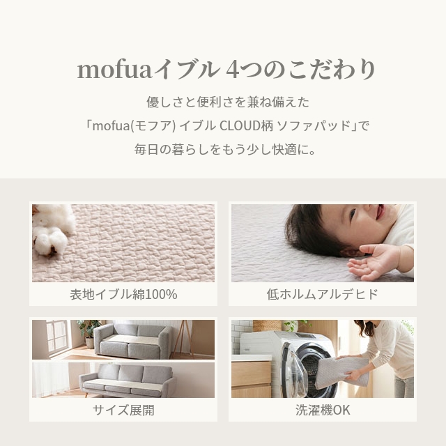 綿100%の優しい肌触りとCLOUD柄が可愛い、mofuaのイブルソファパッド。滑り止め付きでズレにくく、丸洗いOK。お子様やペットがいる家庭の汚れ防止に最適です。