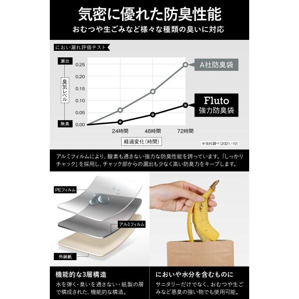 ・3層構造のアルミ蒸着ジッパー袋。臭いの原因を遮断し、しっかりチャックでチャック部のにおい漏れも抑制。