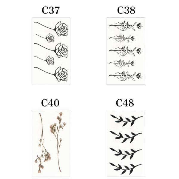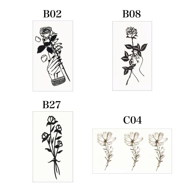モノトーンの花柄タトゥーシール。鮮やかなカラーはちょっと手を出しづらい方や、さりげなくおしゃれを楽しみたい方におすすめです。肩や首、二の腕、手首の内側、足首などに貼って楽しんでください。襟首や裾からチラッとさりげなく覗かせてもすてきです。