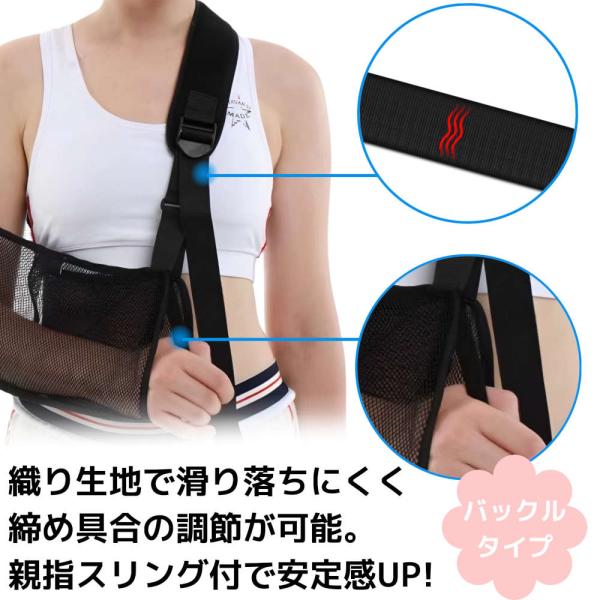本品は厚みをおさえて延びにくいポリエステルメッシュの素材を使用しているため通気性が抜群です。腕の骨折、脱臼、四十肩など、腕や肩のサポータとして利用ください。サイズは腕を置く部分の長さが38-39cmの男女兼用の大人向け。左右兼用。