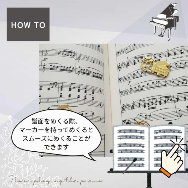 広げられない長い曲の楽譜や連弾の楽譜など、譜面台に楽譜を広げるのが難しい時に譜面めくりをサポートしてくれるマーカークリップです。