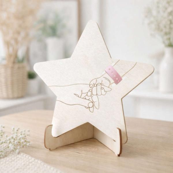 ママと赤ちゃんの初めてのお揃いのネームバンドがおしゃれに飾れるメモリアルプレート♪せっかくの記念品なのに置き場所に困り、育児に追われ、いつの間にか紛失してしまうことが多いと思います。このメモリアルボードなら簡単に保管でき、インテリアとの相性もバッチリな木製素材で温かみを感じられ、おしゃれ感を演出してくれます。一生に一回の記念品であるネームバンドを素敵に保管しましょう。用意を忘れがちなメモリアルアイテムは出産祝いにもとても喜ばれます。