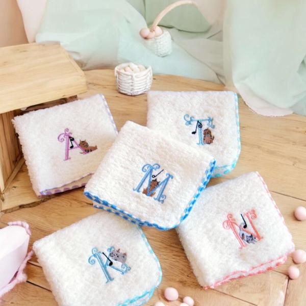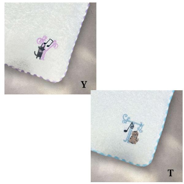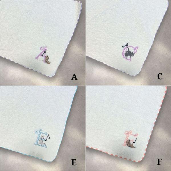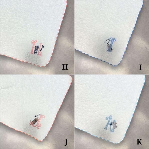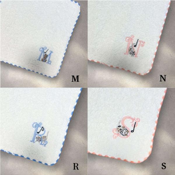 音符とかわいい猫と一緒にイニシャルが刺繍されたタオルハンカチです。