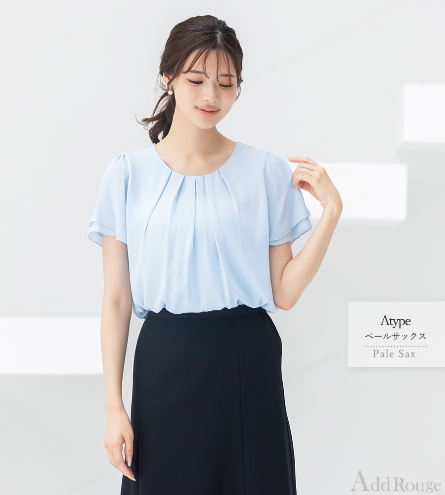 バルーン状の裾がお腹周りを自然にカバー、ふんわりとした胸元タックが女性らしい印象を与えます。