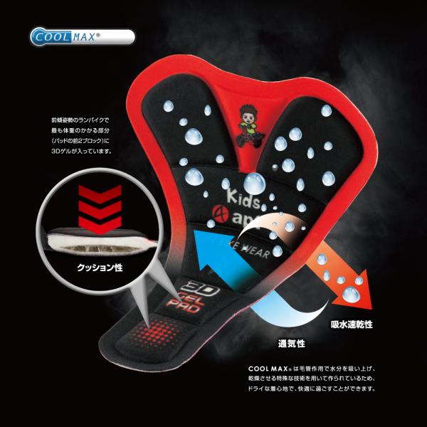 サイクルパンツ本体の素材は、大人用レーサーパンツと同じ、ストレッチ性のある素材で、春から夏、秋口に掛けてご使用頂けます。