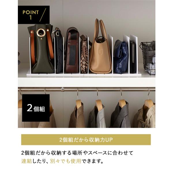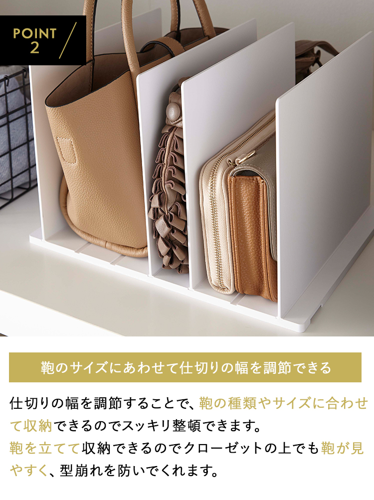 仕切りの幅を調節することで、鞄の種類やサイズに合わせて収納できるのでスッキリ整頓できます。