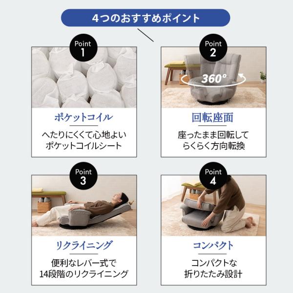 回転座椅子 座椅子 リクライニングチェア 完成品 椅子 チェア 肘付き 肘掛け ポケットコイル 座イス フロアチェア 回転チェア 一人用 コンパクト 収納 送料無料