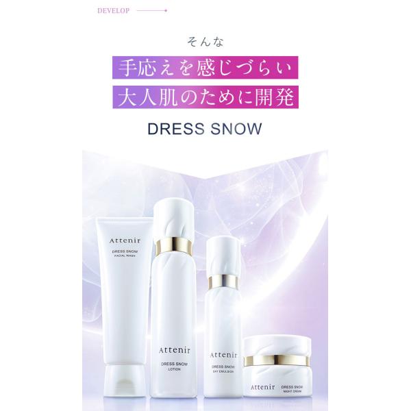 弾むハリも、澄んだ透明感も。大人設計の総合エイジングケア。うるおいを与え満たすことで効率的な美白ケアを叶える化粧水の詰め替え用エコパック。美白とシワ改善、ハリ・弾力も気になる方へおすすめの一挙両立タイプ、ドレススノー。