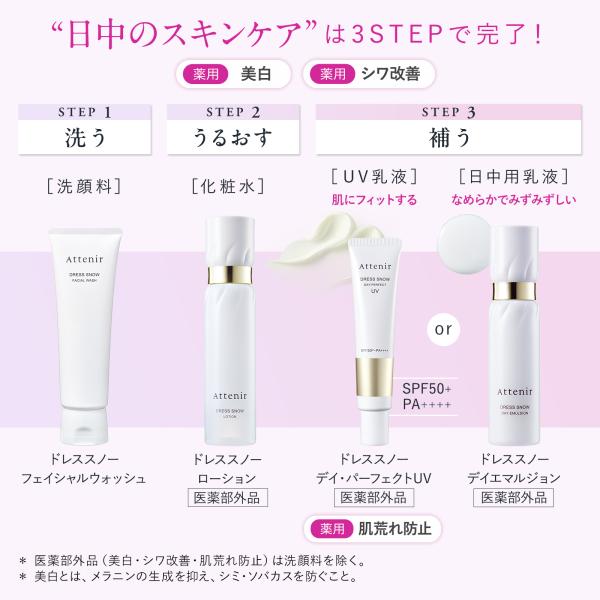 弾むハリも、澄んだ透明感も。大人設計の総合エイジングケア。すき間なくうるおいとハリで満たし、明るさとハリをキープする日中用乳液。美白とシワ改善、ハリ・弾力も気になる方へおすすめの一挙両立タイプ、ドレススノー。