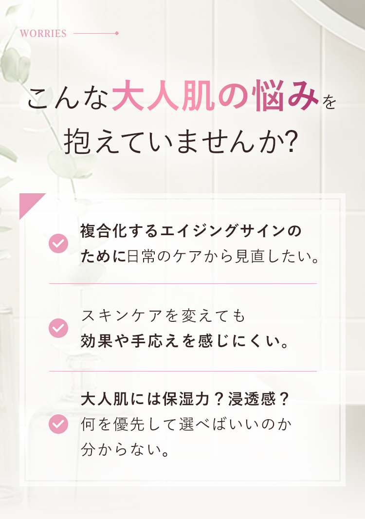 高密度な弾力ハリ肌へ。大人設計のエイジングケア。薬用シワ改善スキンケアセット。手応えを感じづらい大人肌を想ったドレスリフト。ダマスクスローズの香りともっちり肌感触の贅沢な使い心地。
