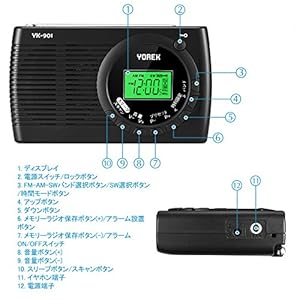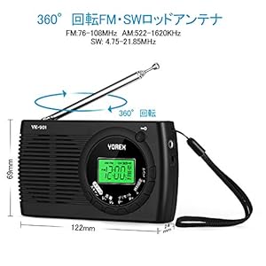 AM/FM/SWラジオを受信可能です、ワイドFM対応!ステレオイヤホンを付属します。 FM:76-108MHz AM:522-1620KHz SW: 3.00-21.85MHz ・本機は多機能DSPラジオです。オートスキャン機能で自動で放送局を検索&保存、アラーム機能とスリープ機能を付いています。誤作業を防止するため、ロック機能も付いています。 ・360度回転ロッドアンテナを搭載、高感度受信できます。ロッドアンテナはMAX45cmまで伸 せます。 ・電源:単3乾電池×2本で給電する、電池の交換が便利です、台風、地震な緊急の時でも使用できます。幅122mm×69mm×24mm