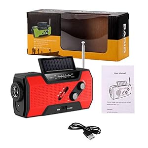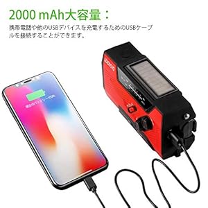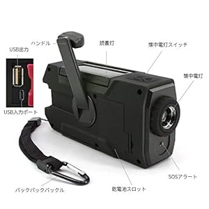 ★【仕様】:●FM/AMラジオ受信:AM 520-1710Khz / FM 87-108MHz ●サイズ:外形寸法157x74x53mm ●重さ:約310g ●防水性:IPX-3 水に濡らさないので、水に沈めないでください。水しぶきや少量の雨から本体を守る防滴仕様で使えできます、大雨で使用する場合ご遠慮ください! ★【使途】:●懐中電灯、読書ライト、SOSアラーム、スマホ充電など機能が付き ●釣り、登山、アウトドア、危険、災害、地震、停電など発生する場合、応急使用できます!フックのデザインがある!携帯便利です! ★懐中電灯/LEDライト/ラジオライト ★読書ライト ★【使用時間】:●満充電状態にはラジオ8-10時間/読書ライト16-20時間使えます。 ●バッテリー1分間手回すと、LEDライトで15~20分間、ラジオは5~10分間、スマホ通話3-5分間使えます。 ★【充電式/付属品】:●充電式:USB ケーブル充電、乾電池充電、手回し充電、太陽光充電