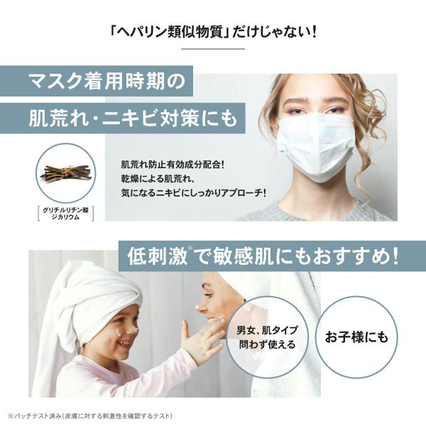 【有効成分】ヘパリン類似物質、グリチルリチン酸ジカリウム【その他の成分】精製水、ジプロピレングリコール、1,3−ブチレングリコール、濃グリセリン、ヒアルロン酸ナトリウム(2)、スクワラン、軽質流動イソパラフィン、自己乳化型モノステアリン酸グリセリル、2−メタクリロイルオキシエチルホスホリルコリン・メタクリル酸ブチル共重合体液、水酸化カリウム、天然ビタミンE、フェノキシエタノール など