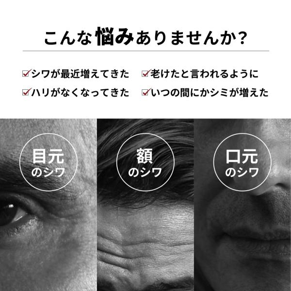 【シワを改善する】薬用有効成分ナイアシンアミドが男性のシワを改善します。ビタミンB群の一種であるナイアシンアミドが肌の弾力を支えるコラーゲン生成を促進して、奥から肌をぐっと押し上げ、シワを改善します。