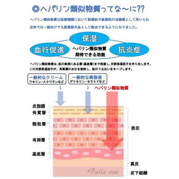 ヘパリン類似物質とグリチルリチン酸ジカリウムの二つの有効成分と、美容成分リピジュア〓やヒアルロン酸を配合した薬用化粧品です。お肌のあれや乾燥を防ぐミルクローションタイプのスキンケアで、その作用は緩和な特性があり、主に予防などが目的となります。