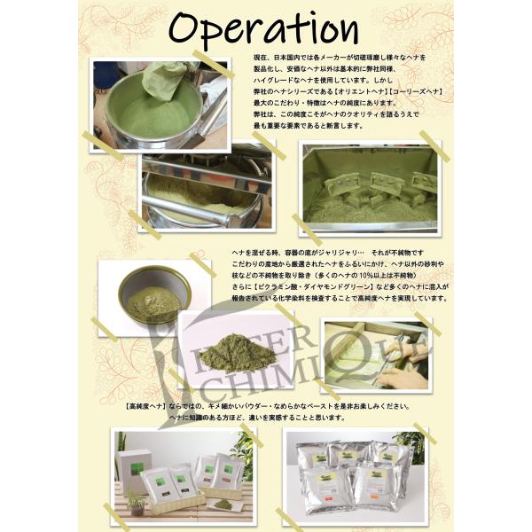 さらに【ピクラミン酸・ダイヤモンドグリーン】など多くのヘナに混入が報告されている化学染料を検査することで高純度ヘナを実現しています。