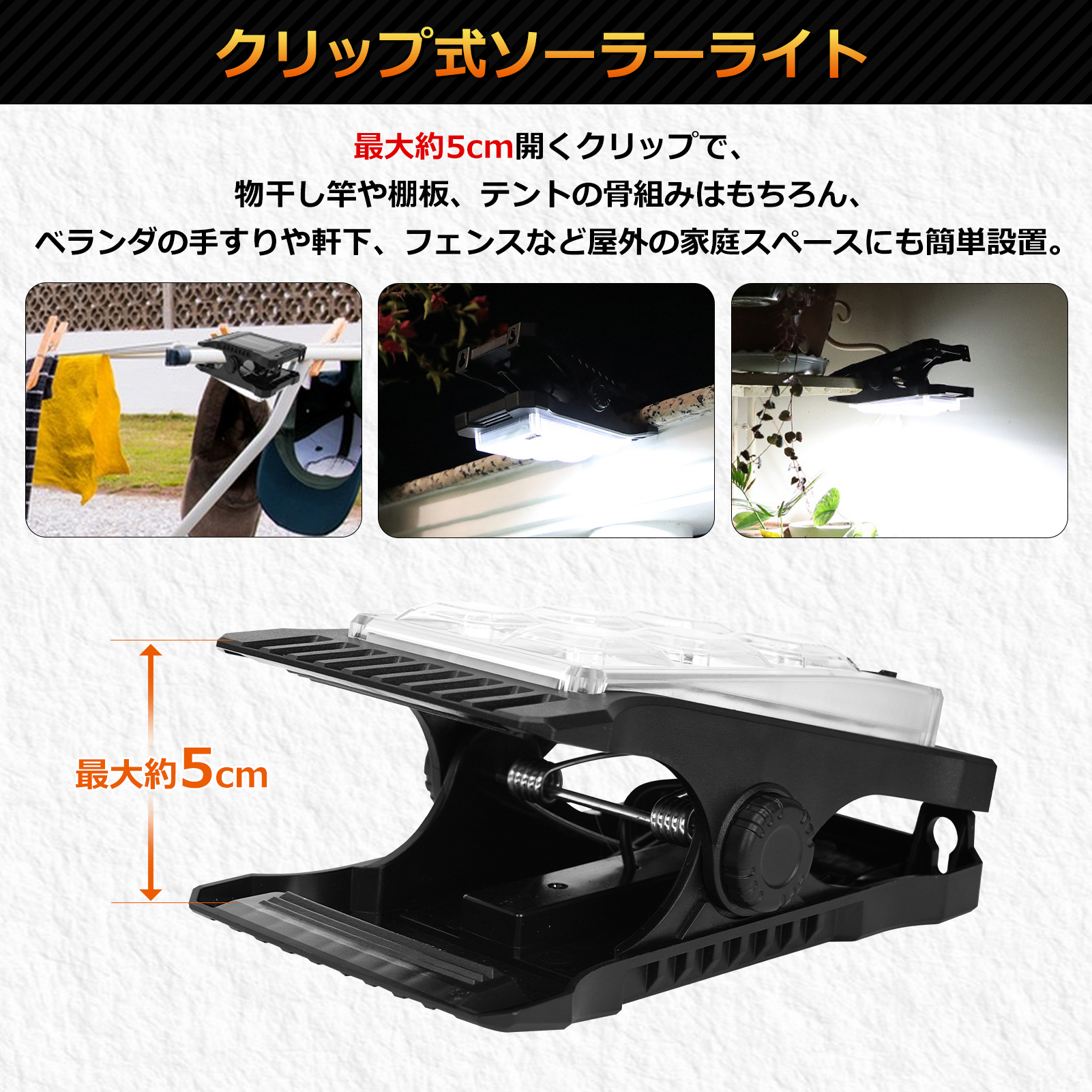 取付方法:クリップ式(最大開口約5cm)