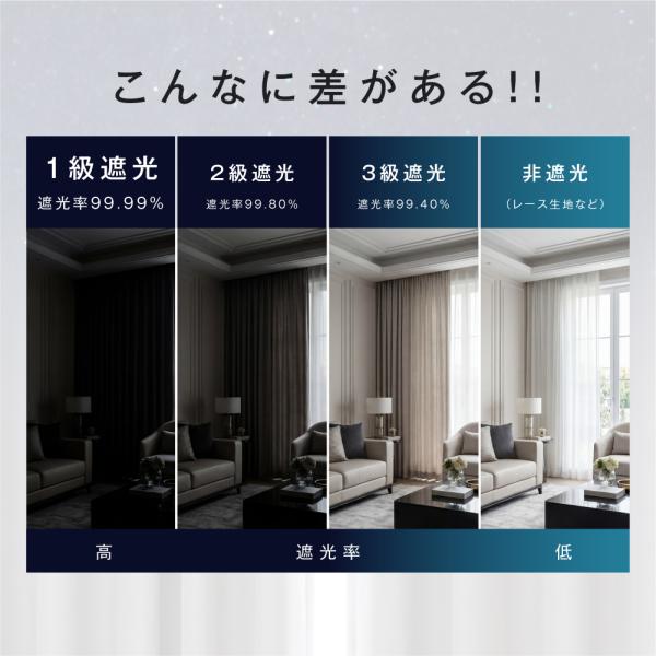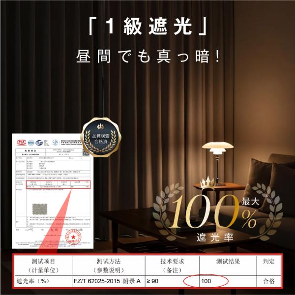 【「1級遮光」昼間でも真っ暗!】カーテン裏側に特殊な樹脂コーティング加工の多層構造を施すことで、光を一切通しません。夜勤明けの昼寝や、ホームシアターを楽しみたい方に最適です。