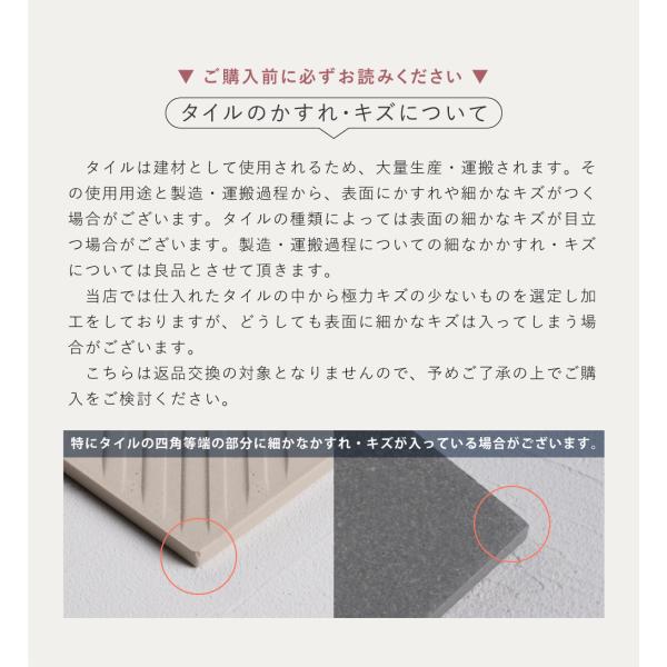 ●タイルは焼きもののため、一点一点、模様や表情が異なります。また、焼きもの特有の自然な色むらと色幅があります。