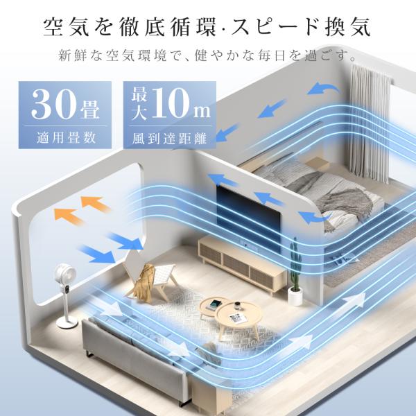 【上下左右自動首振り&風量12段階調整】上下90°C+左右90°の同時首振りモード。部屋の隅々に風を届け、空気をかき回し効率よく循環!12段階風量調節が可能。そよ風のような微風から暑さを吹き飛ばす強風まで、幅広い設定が可能です。